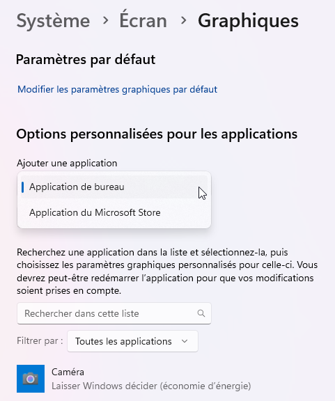 Le soucis d’écran noir au démarrage se produit dans le cas où l’ordinateur est doté de plus d’une carte graphique (une « intégrée » à la carte mère, une seconde ajoutée plus performante par exemple). Windows ne choisit pas automatiquement la bonne carte pour l’affichage ; alors même que l’application RCad’Touch demande expressément d’utiliser la plus performante. Et comme la carte la moins puissante est incapable de supporter l’affichage dans un casque VR, la conséquence est un écran noir.