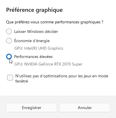 - Modifier ensuite les options pour utiliser l’option « Performances élevées »