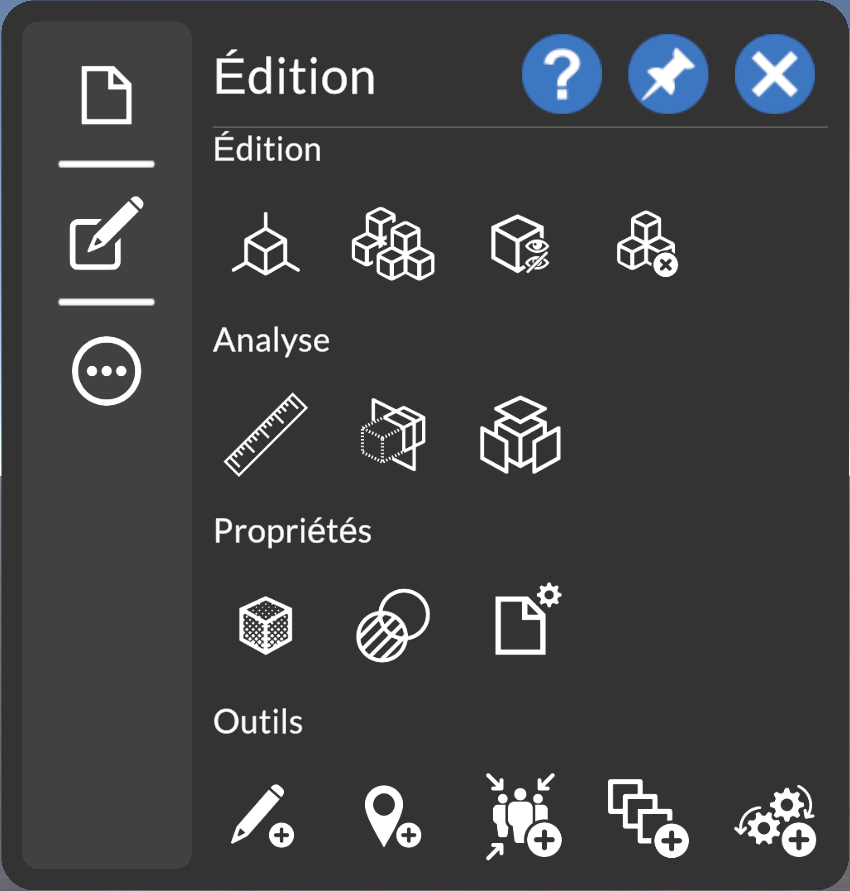 RealityCadLe panneau de commande « Édition » permet d’accéder à l’ensemble des actions qui peuvent être effectuer sur la scène et les éléments 3D. Cela comprend l’analyse et l’édition des éléments 3D, l’enrichissement de la scène, etc.